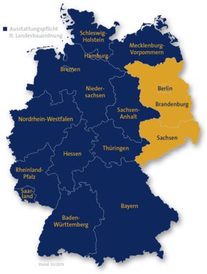 In Deutschland ist die Ausstattungspflicht von Wohnungen mit Rauchwarnmeldern in der jeweiligen Landesbauordnung der einzelnen Bundesländer geregelt. Die Rauchmelderpflicht gilt noch nicht bundesweit (einzig in Berlin, Brandenburg und Sachsen besteht aktuell noch keine Pflicht, ein Beschluss ist aber absehbar), einheitlich festgelegt ist jedoch in allen bisher angepassten Bauordnungen, dass Schlafräume, Kinderzimmern sowie Flure, über die Rettungswege von Aufenthaltsräumen führen, jeweils mindestens einen Rauchwarnmelder haben müssen. Auch das Ende der Übergangsfrist, bis zu der die Rauchwarnmelder installiert sein müssen, ist in jeder Landesbauordnung abweichend geregelt.