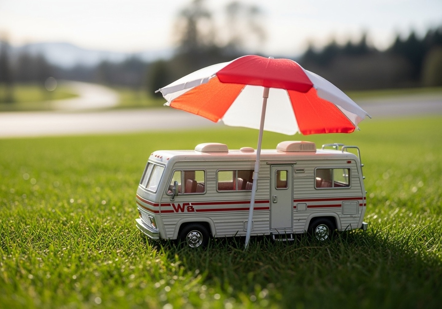 Spielzeug-Wohnmobil wird von einem Sonnenschirm geschützt